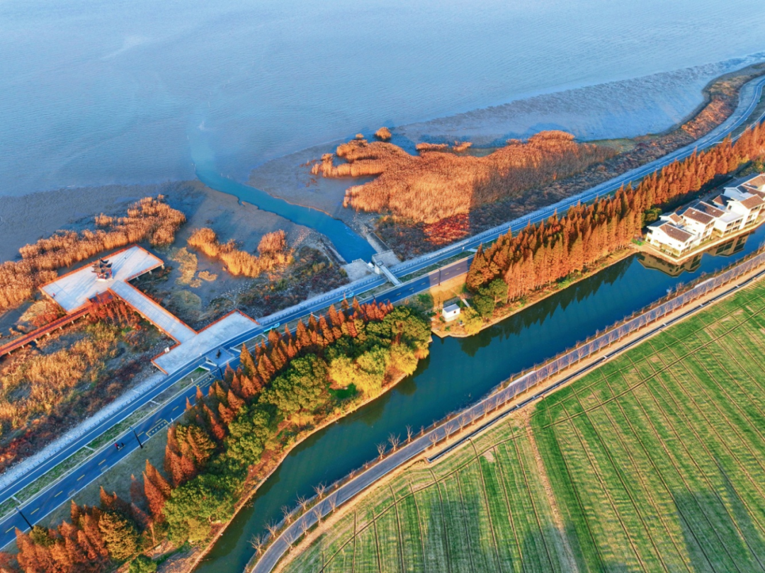 累了?路边的青年议事亭可歇脚,临湖的村民议事亭能赏景 —— 座椅旁就是江风拂过的绿意,抬头可见白鹭掠过江面,翅膀带起碎金般的波光。从这里出发,12 公里滨江亲水景观带一路铺展,万亩芦苇荡在风中“沙沙”作响,红杉林倒映江面,构成“人在画中游”的动线。难怪有游客说:“开在永兴园路,不是在赶路,是在逛自然博物馆。”