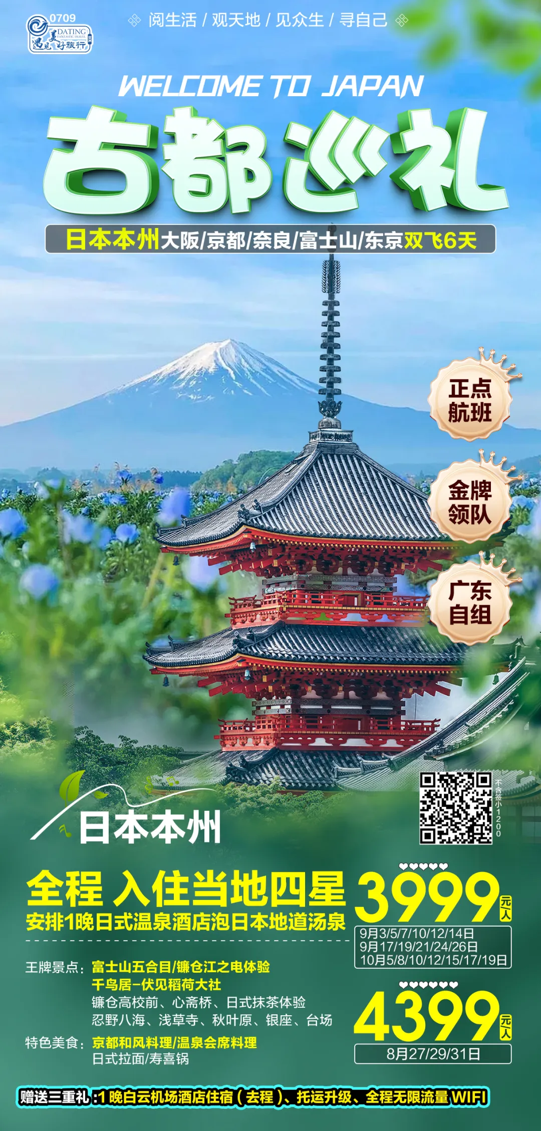 打卡日本古都,富士山、忍野八海、大阪城公园、江之岛等人气景点;