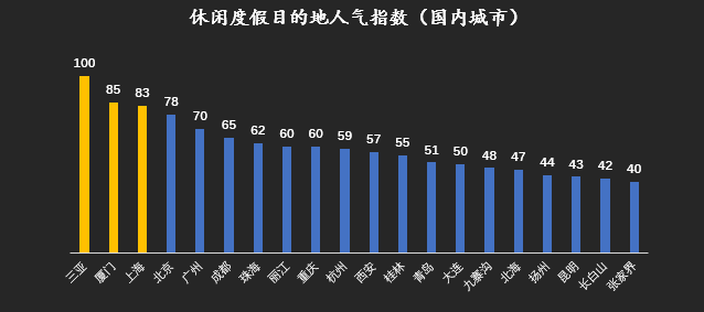从今年度假产品到达的目的地城市来看,三亚、厦门、上海、北京、广州、成都、珠海、丽江、重庆、杭州、西安、桂林、青岛、大连、九寨沟、北海、扬州、昆明、长白山、张家界人气指数最高。滨海目的地具有天然优势。