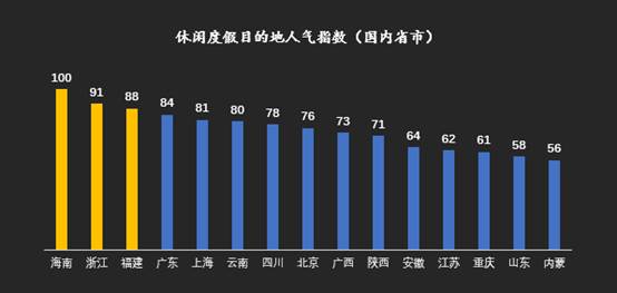 国内旅游休闲度假哪里最热?从在线预定度假产品的人次大数据排名,年度休闲度假人气指数最高的15个国内省市分别是海南、浙江、福建、广东、上海、四川、北京、云南、广西、陕西、安徽、江苏、重庆、山东、内蒙。其中50%的休闲游客都集中在前十个省份。