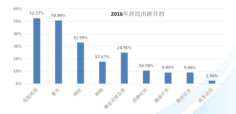 休闲旅游已经成为旅游业最重要的组成部分,根据中国旅游研究院发布的报告,2016年有52.7%的游客以将休闲度假作为出游目的,比例高于观光旅游。报告认为,到2017年休闲度假旅游在整体旅游市场占比超过50%。