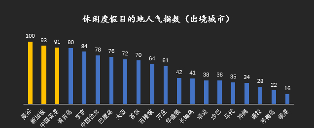 从出境来看,马代(97)、夏威夷(93)、大溪地(91)、毛里求斯(91)、斐济(86)、塞舌尔(83)、巴厘岛(80)、长滩岛(77)、沙巴(74)、普吉岛(72)、中国台湾(70)、迪拜(69)、中国香港(66)、巴黎(65)、伊斯坦布尔(60)是境外休闲旅游度假指数最高的15强目的地。
