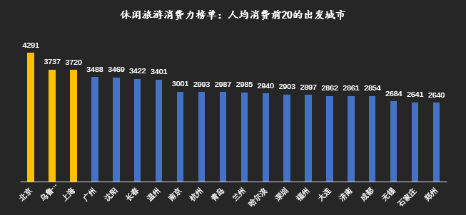 人均消费最高的城市分别是北京(4291)、乌鲁木齐(3737)、上海(3720)、广州(3488)、沈阳(3469)、长春(3422)、温州(3401)、南京(3001)、杭州(2993)、青岛(2987)。此外,兰州、哈尔滨、深圳、福州、大连、济南、成都、无锡、石家庄、郑州等城市,也位居休闲旅游消费力前20。与收入水平基本成正比,北上等一线城市与其他城市拉开差距。