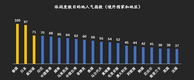 从国家来看,休闲度假人气指数最高的目的地分别是泰国、日本、新加坡、中国香港、印尼、越南、马来西亚、中国台湾、菲律宾、美国、马尔代夫、柬埔寨、毛里求斯、澳大利亚、阿联酋、韩国、尼泊尔、斯里兰卡、英国、法国。其中50%的游客集中在东南亚地区,特别是海岛,成为中国游客休闲旅游后花园。
