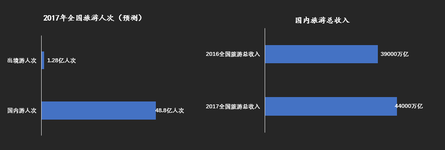 中国休闲度假旅游基于规模庞大的旅游市场基础,报告根据官方公布数据预测,2017年全国旅游人次可能达到48.8亿人次,出境游人次将达到1.28亿人次,国内旅游总收入将达到4.4万亿元。
