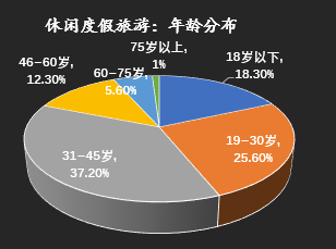 消费能力强、体力充沛的31-45岁(占比37.2%)、19-30岁(25.6%)人群成为休闲旅游主力军,与普通观光跟团游相比,休闲旅游群体呈现明显的年轻化、壮年派趋势。