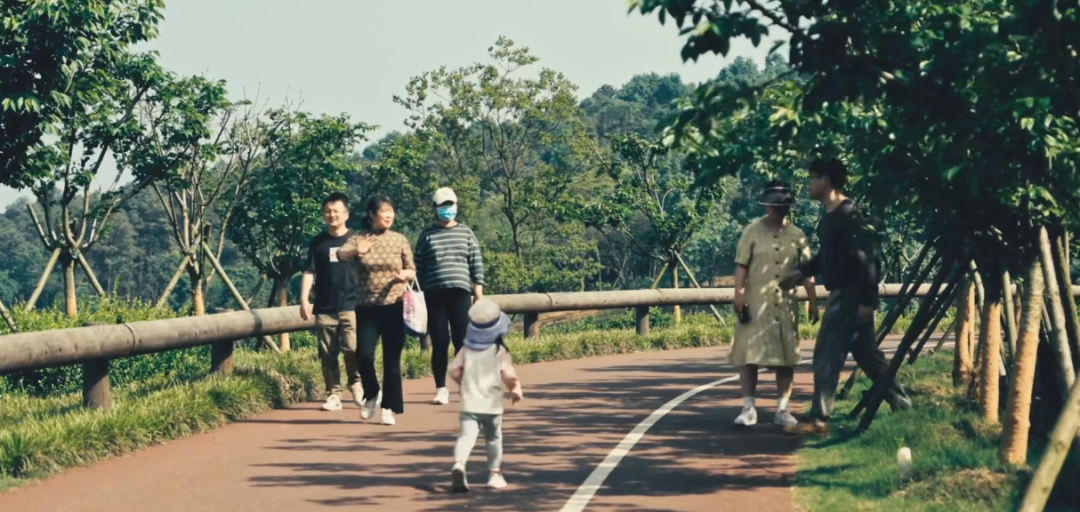 在公园步道上散步、骑行、垂钓
