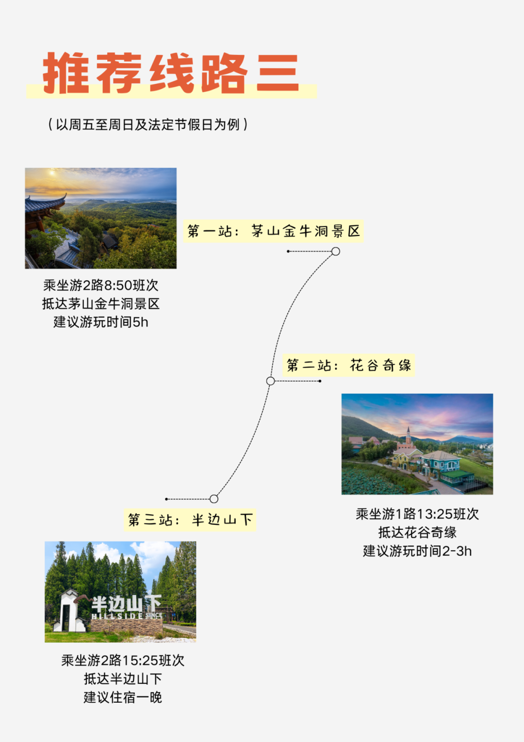 茅山游客服务中心→花谷奇缘→金牛山庄(半边山下)→茅山索道(金牛洞景区)→元阳观(保朴山房)→茅山三清观→仙姑村(一号农场)→茅山森林世界→乾元观→茅山颐园(江南医院)→东方盐湖城(访仙路口)→新浮公园→茅山茶海等站。