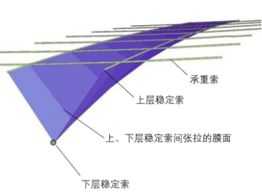 膜面张拉于上下层稳定索之间,上层稳定索形成了膜面的脊索,下层稳定索形成了膜面的谷索,有效提供了膜面的空间刚度。索网组成如图6~10所示。