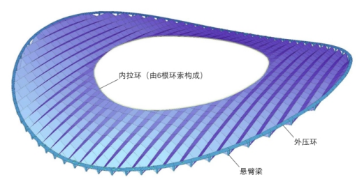 内部柔性索膜结构包括外压环、悬臂梁、内拉环以及其间张拉的双层双向的正交索网体系,其中双层双向的正交索网体系由承重索、上层稳定索、下层稳定索以及连接上下层索网的膜面和提升索构成。