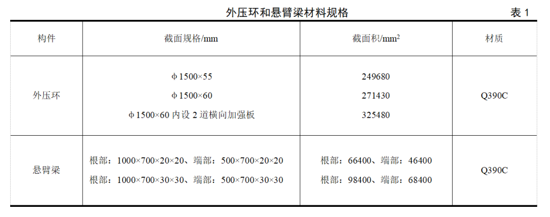 外压环和悬臂梁构成内部索膜屋盖的外边界,均采用Q390C钢材。外压环采用外径为1.5m的圆管截面,壁厚为55mm和60mm两种,其中,部分60mm厚管段内部设置两道横向加劲板;悬臂梁采用变截面箱形截面,根部截面大,端部截面小,板厚分为20mm和30mm两种。具体材料规格见表1。