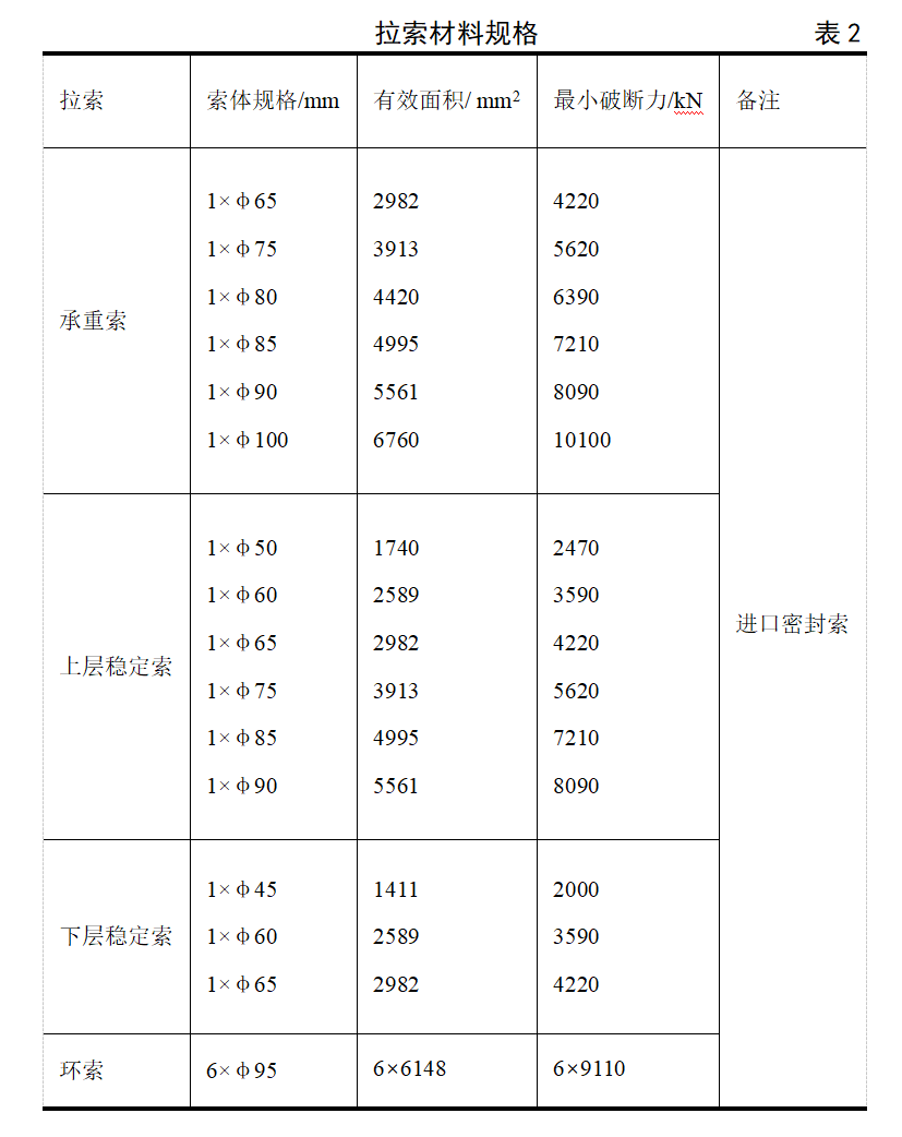 该工程承重索、上下层稳定索以及构成内拉环的环索均采用进口密封索,密封索具有非常好的横向承压能力以及索夹的抗滑能力,并且它也具备优秀的防锈蚀能力以及抗疲劳能力。该工程的拉索规格较多,具体规格见表2。