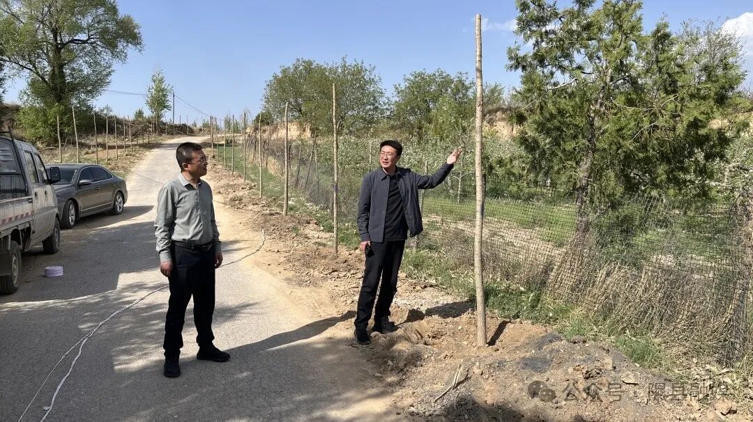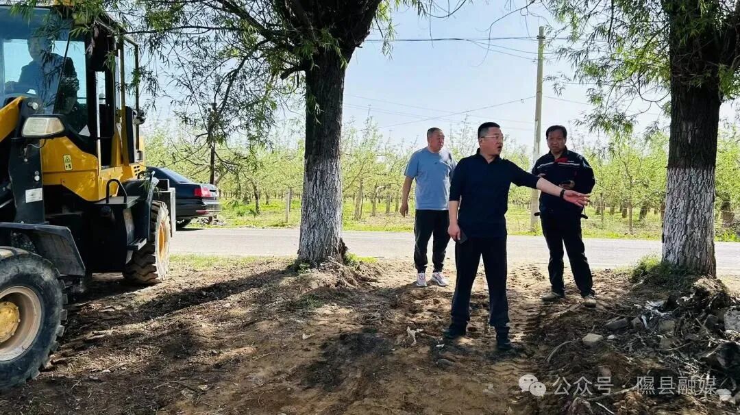 4月25日,下李乡乡长张鹏飞在太平村实地查看市级乡村振兴示范村项目建设进展及通村道路绿化情况。